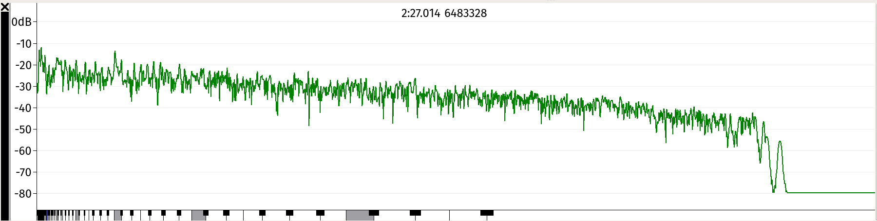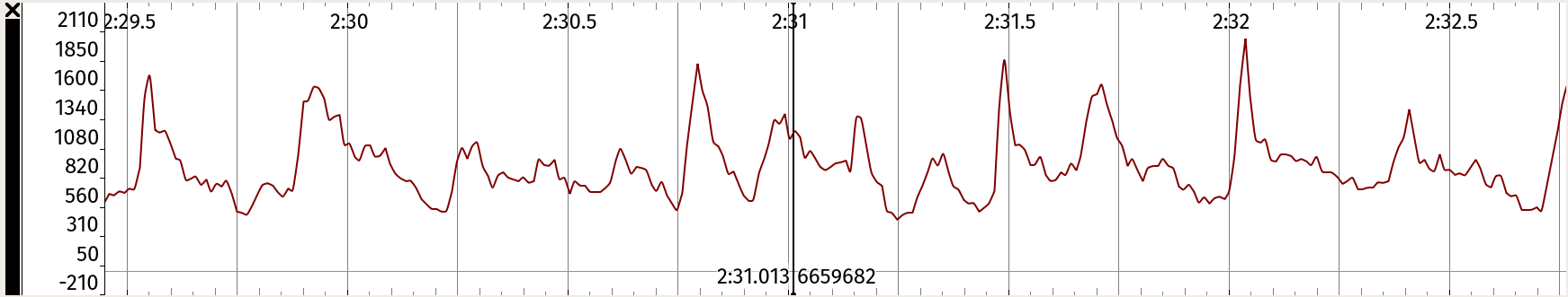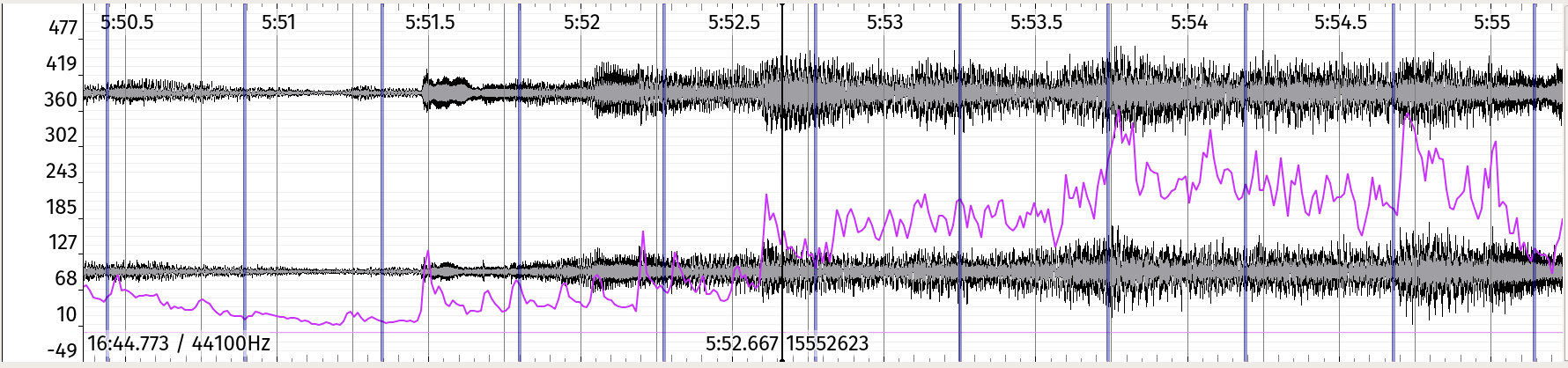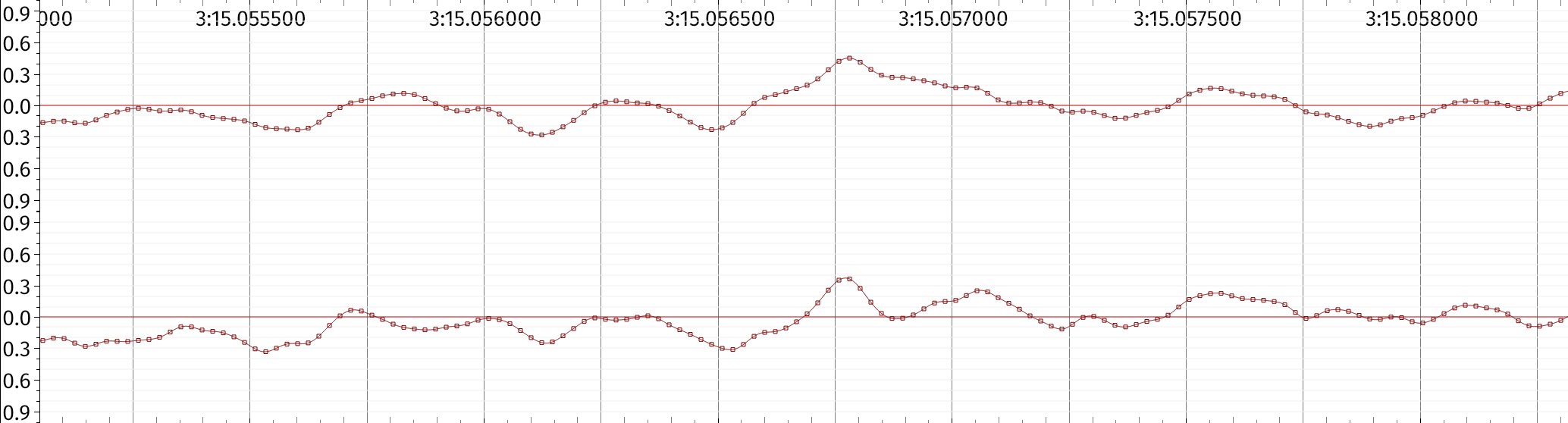 Each pixel on the horizontal axis shows the peak and mean positive and negative values found in samples falling within that pixel's range at the current zoom level. The zoom level can be increased or decreased using the mouse wheel or the Up and Down cursor keys.