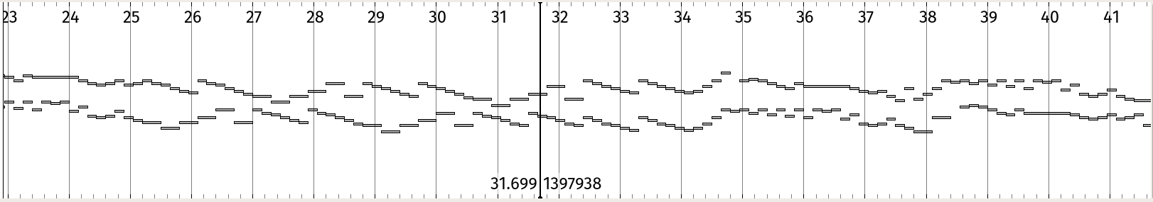 Once alignment is completed, when you scroll or play through one of the audio files, Sonic Visualiser will position the other files so as to align them by source material with the one you are scrolling. For example, if one audio file contains a recording at twice the tempo of the other, you should expect the scrolling and playback pointer motion in the slower file to happen at twice the speed in terms of pixels, because the slower file takes up twice as many audio samples for the same period of the original score as the faster one. (Although counter-intuitive when described, this makes sense in use!)