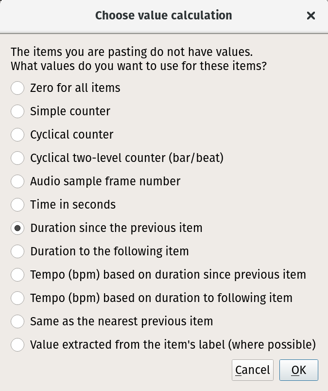 If the target layer is of a type that represents less information than the source — for example if you are pasting to a time instant layer from a time/value curve — then the relevant information (in this case time positions) will be retained, and the rest discarded.