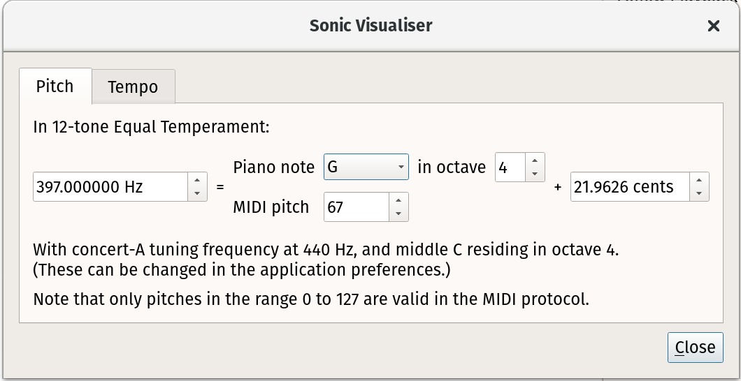 The pitch converter has fields in which you can enter a fundamental frequency value, MIDI pitch, or note name; whenever you change the value in any field, all of the other fields are updated so that the displayed frequency and displayed pitch match up. (For example, if you enter 261Hz, the other fields will update to show middle C, with a small rounding error reflected as an offset in the cents field at the right.) All conversions simplistically assume 12-tone equal temperament, so that it makes no difference which key is in effect, and are carried out relative to the reference tuning frequency and MIDI octave numbering currently set in the application preferences.